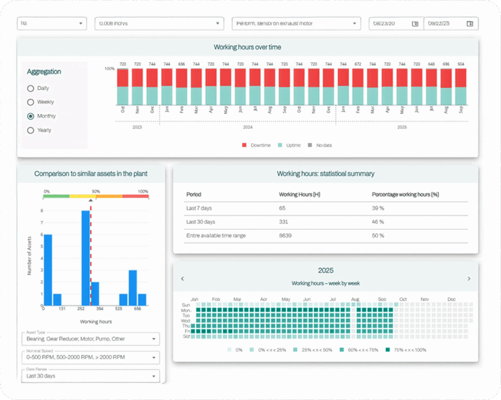 The “Working hours – week by week” graph gives you a calendar-style view of asset usage. This makes it easy to spot long-term trends and identify anomalies by reviewing day-by-day data over several months.